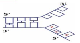 Sơ đồ bên biểu diễn quá trình nhân đôi DNA, hãy cho biết mạch mới liên tục sẽ có trình tự nucleotide là (tính từ đoạn phân tử được tháo xoắn)?