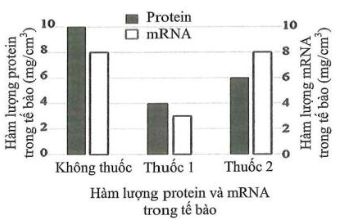 | b) Thuốc 1 làm giảm hàm lượng mRNA so với không xử lí thuốc dẫn đến làm giảm hàm lượng protein do protein là sản phẩm sau dịch mã. | ||