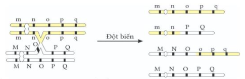 Một loài thực vật lưỡng bội sinh sản hữu tính, xét cặp NST số 1 chứa các cặp gene M, m, N, n, P, p, Q, q. Giả sử quá trình giảm phân ở một số tế bào của cây A xảy ra hiện tượng đột biến được mô tả như hình sau:
