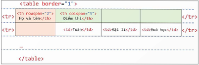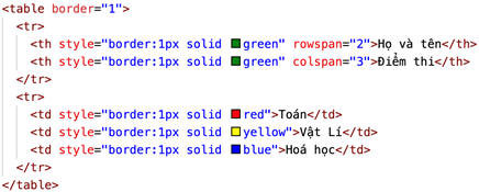 Sửa lại chương trình trong hình dưới đây, sử dụng thuộc tính style thay vì thuộc tính border để tạo viền cho bảng. Sử dụng màu xanh cho viền của ô hai dòng đầu bảng và sử dụng ba màu đỏ, vàng, xanh cho ba chữ Toán, Vật lí và Hoá học.