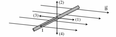 Hình vẽ bên mô tả một dây dẫn mang dòng điện được đặt trong một từ trường có phương nằm ngang. Mũi tên nào cho biết chiều của lực từ tác dụng lên dây dẫn?