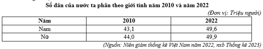 Căn cứ vào bảng số liệu trên, hãy cho biết năm 2022 so với năm 2010, tỉ số giới tính của nước ta tăng lên bao nhiêu nam/100 nữ? (làm tròn kết quả đến một chữ số thập phân).