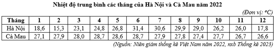 Căn cứ vào bảng số liệu trên, hãy cho biết năm 2022, nhiệt độ trung bình năm của Hà Nội thấp hơn nhiệt độ trung bình năm của Cà Mau là bao nhiêu oC? (làm tròn kết quả đến một chữ số thập phân).