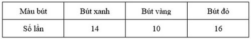 Trong hộp có một số bút xanh, một số bút vàng và một số bút đỏ. lấy ngẫu nhiên 1 bút từ hộp, xem màu gì rồi trả lại. Lặp lại hoạt động trên 40 lần ta được kết quả như sau: