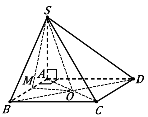 Cho hình chóp \(S.ABCD\) có đáy \(ABCD\) hình vuông cạnh \(a\) và \(SA \bot ABCD\) và \(SA = a\sqrt 2 \). Gọi \(O\) là tâm của hình vuông \(ABCD\). Gọi \(\alpha \) là góc giữa \(SO\) với mặt phẳng \(\left( {SAB} \right)\). Tính \({\rm{sin}}\alpha \)