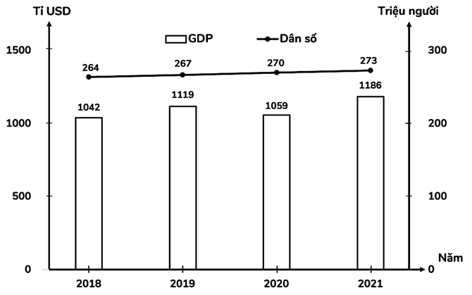 Cho biểu đồ: GDP và dân số của In-đô-nê-xi-a giai đoạn 2018 –
