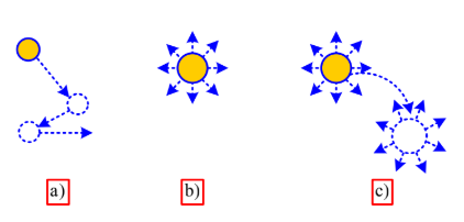 Hình bên mô tả chuyển động phân tử ở các trạng thái khác nhau. Hình cầu là phân tử, mũi tên chỉ hướng chuyển động của các phân tử tương ứng với các trạng thái: thể rắn, thể lỏng và thể khí lần lượt là: