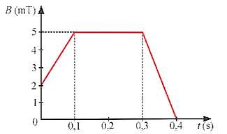 Một khung dây dẫn kín, phẳng có diện tích \(10c{m^2}\), gồm 100 vòng dây, đặt trong từ trường có vectơ cảm ứng từ vuông góc với mặt phẳng khung dây. Độ lớn cảm ứng từ biến thiên theo thời gian như đồ thị Hình vẽ. Độ lớn suất điện động xuất hiện trong khung dây trong khoảng thời gian 0 đến 0,1 s.