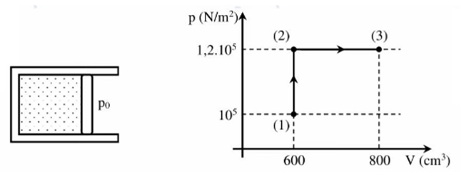Cho hệ xilanh và pit-tông nằm ngang. Ở thời điểm ban đầu trong xilanh có chứa một thể tích 600 cm3 khí lí tưởng ở nhiệt độ \({t_1} = {29^0}C\), áp suất bằng áp suất khí quyển \({p_0} = {10^5}N/m\). Khi được làm nóng chậm, quá trình biến đổi trạng thái của chất khí được cho như đồ thị hình vẽ. Biết diện tích tiết diện của pittông là \(S = 30c{m^2}\).