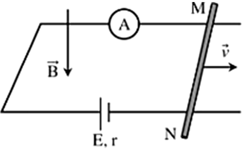 Cho mạch điện như hình vẽ, nguồn có suất điện động E = 1,2 V, điện trở trong \(r = 0,2\Omega \). Thanh MN có chiều dài 0,8 m có điện trở \(R = 1,8\Omega \). Từ trường \(\overrightarrow B \) có phương thẳng đứng, hướng xuống và vuông góc với mặt khung như hình vẽ và B = 0,4 T. Thanh MN dài có điện trở không đáng kể.