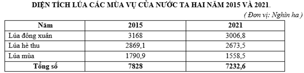 Cho bảng số liệu: Căn cứ vào bảng số liệu trên, tính tỉ trọng lúa