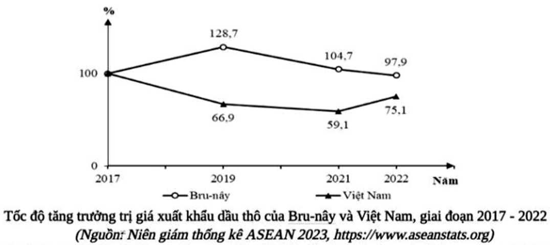 Dựa vào sự thay đổi tốc độ tăng trưởng trị giá xuất khẩu dầu thô của Bru-nây và Việt Nam giai đoạn 2017 – 2022 và nguyên nhân tạo ra sự thay đổi đó.