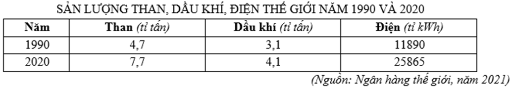 | a) Sản lượng than, dầu và điện của thế giới đều tăng từ 1990 đến 2020. | ||