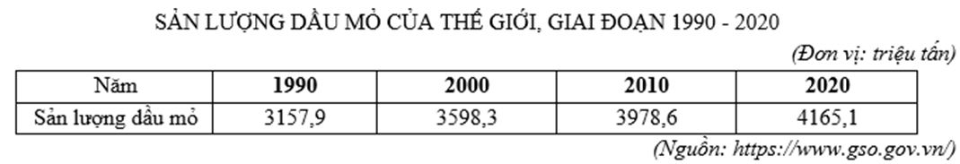 Căn cứ vào bảng số liệu trên, tính tốc độ tăng trưởng sản lượng dầu mỏ của thế giới năm 2020 so với năm 1990 (coi sản lượng năm 1990 = 100%) (làm tròn kết quả đến hàng đơn vị của %)