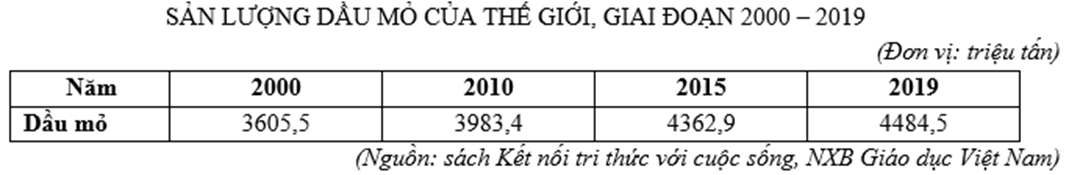Căn cứ vào bảng số liệu trên, cho biết giai đoạn 2000 – 2019, sản lượng dầu mỏ của thế giới mỗi năm tăng trung bình lên bao nhiêu triệu tấn? (làm tròn đến một chữ số thập phân)