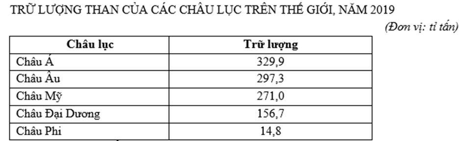 Căn cứ vào bảng số liệu trên, tính tổng trữ lượng than của các châu lục năm 2019. (làm tròn kết quả đến hàng đơn vị của tỉ tấn)
