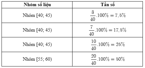 1) Lập bảng tính tần số bằng công thức tần số = số học sinh của nhóm / tổng số học sinh * 100%