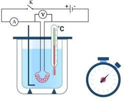Một học sinh làm thí nghiệm đo nhiệt dung riêng của nước theo sơ đồ như hình bên. Khối lượng nước là 160 g, nhiệt độ ban đầu là \({25^0}C\). Số chỉ vôn kế và ampe kế lần lượt là 18 V và 2,50 A. Sau khoảng thời gian 2 phút 30 giây thì nhiệt độ của nước là \({35^0}C\). Bỏ qua nhiệt lượng mà bình nhiệt lượng kế, đũa khuấy thu vào và bỏ qua nhiệt lượng dây nung tỏa ra môi trường không khí.