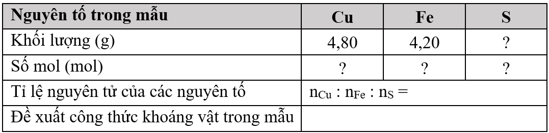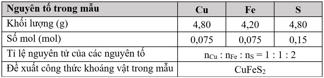 Có khoáng vật được đặt tên là chalcopyrite. Khi phân tích 13,80 gam một mẫu chalcopyrite thì thấy có chứa 4,80 gam nguyên tố đồng; 4,20 nguyên tố sắt; còn lại là nguyên tố lưu huỳnh.