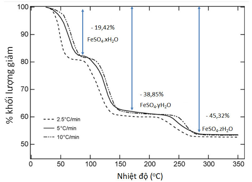 Tiến hành sấy các mẫu Iron(II) sulfate heptahydrate (FeSO4.7H2O) với độ tinh khiết 99,99% với các khoảng nhiệt độ tăng dần và xử lý số liệu thu được đồ thị như sau: