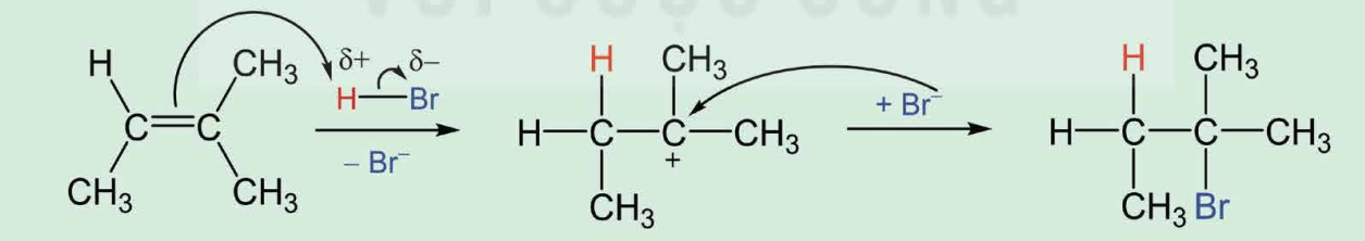 Có hai loại tác nhân phổ biến trong các phản ứng hữu cơ là tác nhân electrophile và tác nhân nucleophile. Tác nhân electrophile là tác nhân có ái lực với electron, chúng thường là các tiểu phân mang điện tích dương (như H+, +NO2,…) hoặc có trung tâm mang một phần điện tích dương (như \(\mathop C\limits^{\partial + } {H_3} - \mathop {Cl}\limits^{\partial - } \) ,…). Tác nhân nucleophile là tác nhân có ái lực với hạt nhân, chúng thường là các tiểu phân mang điện tích âm (như Br-, HO-, CH3O-,…) hoặc có cặp electron hóa trị tự do (như NH3, H2O,…). Cho phản ứng xảy ra như sau: