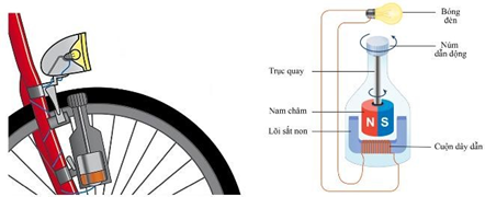 | b) Khi quay núm dẫn dộng của Dynamo thì nam châm quay theo làm số đường sức từ xuyên qua tiết diện dây S của cuộn dây biến thiên, nên xuất hiện dòng điện xoay chiều đi qua cuộn dây làm bóng đèn sáng. | ||