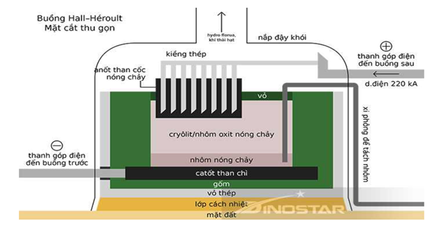 Al2O3 có nhiệt độ nóng chảy rất cao (2072°C) nên việc điện phân nóng chảy Al2O3 nguyên chất sẽ khó thực hiện. Hiện nay, theo công nghệ Hall-Héroult, người ta hoà tan Al2O3 trong cryolite (Na3AlF6) nóng chảy được hỗn hợp chất điện phân có nhiệt độ nóng chảy thấp hơn (khoảng gần 1000°C). Giải pháp này giúp tiết kiệm năng lượng, đồng thời tạo ra chất lỏng có tính dẫn điện tốt, nhẹ hơn Al và nổi lên phía trên lớp Al lỏng, bảo vệ Al không bị oxi hoá bởi không khí. Sơ đồ thùng điện phân được biểu diễn như hình dưới: