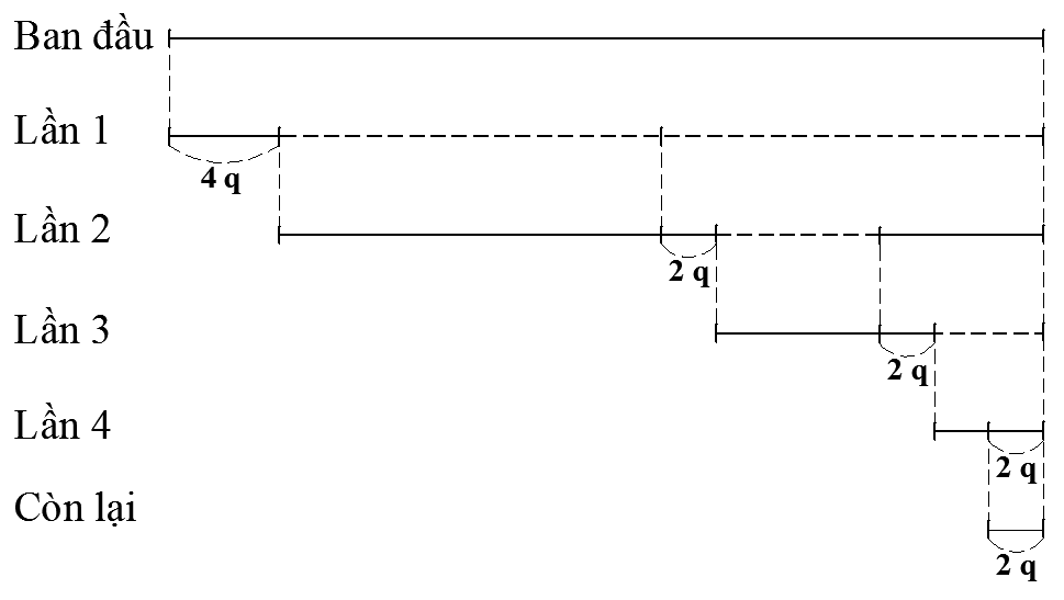 Có một số cam, lần thứ nhất bán 4 quả, lần thứ hai bán \(\dfrac{1}{2}\) số quả còn lại và 2 quả, lần thứ ba cũng bán \(\dfrac{1}{2}\) số quả còn lại và 2 quả, lần thứ tư bán \(\dfrac{1}{2}\) số quả còn lại, còn lại 2 quả. Tính số cam ban đầu.
