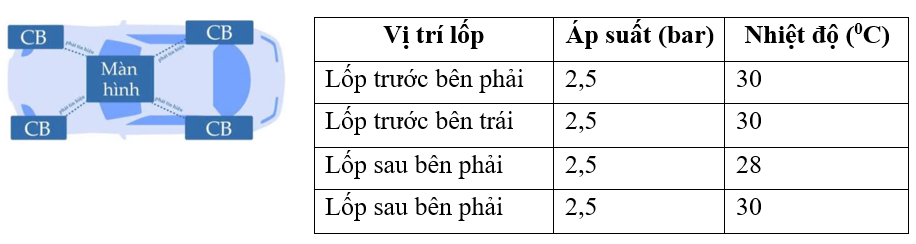 Cảm biến lốp ô tô là thiết bị điện tử được thiết kế để giám sát các thông số bên trong lốp xe. Một ô tô được trang bị bộ cảm biến gồm bốn cảm biến (CB) và một màn hình hiển thị. Khi ô tô đang đứng yên, màn hình hiển thị chỉ số các thông số được cho ở bảng dưới đây: