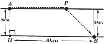 Người ta muốn lắp một ống dẫn dầu từ nhà máy lọc dầu ở vị trí A đến kho chứa dầu đặt ở vị trí B qua một con sông rộng 2km, dài 6km. Chi phí lắp đặt đường ống dẫn dầu trên mặt đất để nối từ nhà máy lọc dầu đến trạm trung chuyển tại vị trí P là 4 tỷ VNĐ/km và chi phí lắp đặt ống dẫn dầu dưới dòng sông để nối từ P đến kho chứa dầu tại vị trí B là 8 tỷ VNĐ/km (như hình vẽ dưới). Hỏi để chi phí lắp đặt ít nhất, cần đặt vị trí P cách nhà máy lọc dầu là bao nhiêu kilômét? (làm tròn kết quả đến hàng phần trăm).