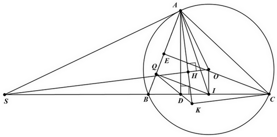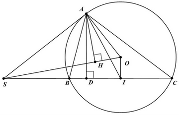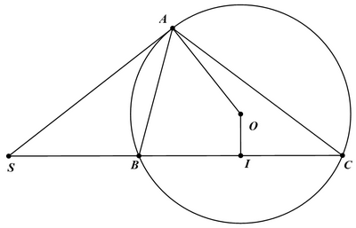 2) Cho tam giác \(ABC\) có ba góc nhọn (\(AB < AC\)), nội tiếp đường tròn \(\left( O \right)\). Tiếp tuyến tại điểm \(A\) của đường tròn \(\left( O \right)\) cắt đường thẳng \(BC\) tại điểm \(S\). Gọi \(I\) là chân đường vuông góc kẻ từ điểm \(O\) đến đường thẳng \(BC\).