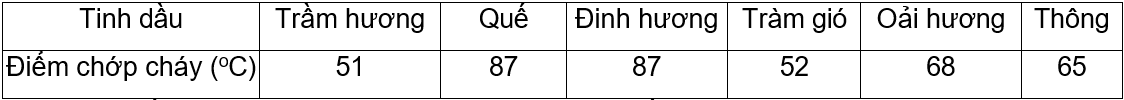 Theo quy định, tất cả các loại chất lỏng, tinh dầu được coi là chất lỏng dễ cháy và là hàng hoá nguy hiểm nếu có điểm chớp cháy nhỏ hơn 600C không được vận chuyển qua đường hàng không. Cho điểm chớp cháy của một số loại tinh dầu thường gặp như sau: