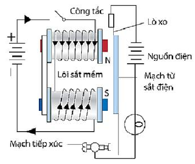 Mạch Rơle là một thiết bị gồm hai mạch: Mạch nhỏ gồm 1 công tắc K, 1 nguồn điện bên tay trái trong hình và hai cuộn dây lõi sắt mềm. Mạch chính (mạch tiếp xúc) gồm 1 nguồn điện bên tay phải trong hình và một mạch từ sắt mềm là một thanh kim loại có thể di chuyển sang trái và phải để có thể đóng mở mạch tiếp xúc. Khi đóng công tắc K, dòng điện trong mạch nhỏ chạy qua 2 cuộn dây của role tạo thành một nam châm điện từ đó sinh ra từ trường, từ trường này sẽ hút mạch từ sắt mềm về phía nam châm điện. Điều này làm cho mạch tiếp xúc hoạt động. Muốn mạch tiếp xúc dừng hoạt đông ta mở khóa K. Mạch rơle hoạt động dựa trên hiện tượng vật lí nào sau đây?