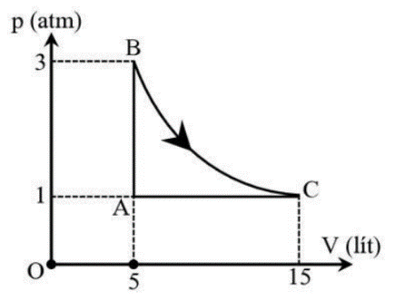 Một khối khí lý tưởng đơn nguyên tử có thể tích V = 5 l ở áp suất khí quyển \(p = 1,{013.10^5}\,\,Pa\) và nhiệt độ T = 300 K (điểm A trong hình). Nó được làm nóng ở thể tích không đổi đến áp suất 3 atm (điểm B). Sau đó, nó được giãn nở đẳng nhiệt đến áp suất 1atm (điểm C) và cuối cùng bị nén đẳng áp về trạng thái ban đầu.