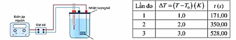 | b) Trình tự thí nghiệm: Nối Wall kế với biến áp nguồn và nhiệt lượng kế. Giữ nguyên điện áp nguồn; Ghi giá trị các thời điểm mà nhiệt kế tăng thêm 1 K, 2 K, 3 K; Lặp lại các thao tác. |