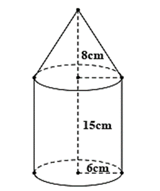 Một chi tiết máy bằng kim loại được ghép thành từ một khối có dạng hình trụ với bán kính của đường tròn đáy là 6 cm; chiều cao \(h = 15\;cm\) và một khối có dạng hình nón với bán kính của đường tròn đáy bằng với bán kính đáy của khối hình trụ; chiều cao \({h_2} = 8\;cm\) (như hình vẽ).