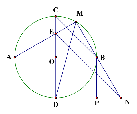 Cho \((O)\) đường kính \(AB\). Kẻ đường kính \(CD\) vuông góc với \(AB\). Lấy \(M\) thuộc cung nhỏ \(BC\), \(AM\) cắt \(CD\) tại \(E\). Qua \(D\) kẻ tiếp tuyến với \((O)\)cắt đường thẳng \(BM\) tại \(N\). Gọi \(P\) là hình chiếu vuông góc của \(B\) lên \(DN\).