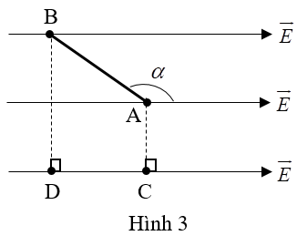 Có một điện tích điểm q di chuyển từ điểm A đến điểm B trong điện trường đều \(\overrightarrow E \) như hình 3 thì biểu thức tính công của lực điện là