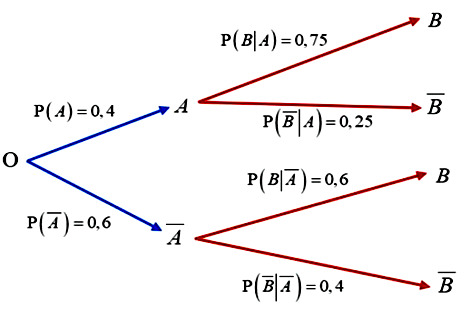 | b) \(P(\bar B\mid A) = 0,75\) và \(P(\bar B\mid \bar A) = 0,6\). | ||