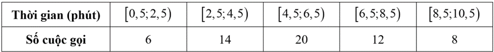 Cho bảng tần số ghép nhóm sau về thời gian gọi (phút) của một số cuộc gọi điện thoại: