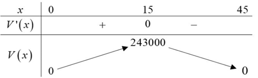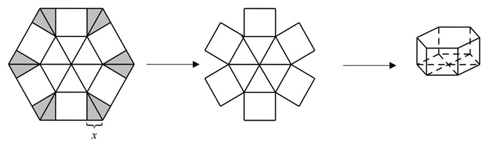 Cho một tấm nhôm hinh lục giác đều cạnh \(90(\;{\rm{cm}})\). Người ta cắt ở mỗi đinh của tấm nhôm hai hình tam giác vuông bằng nhau, biết cạnh góc vuông nhỏ bằng \(x(\;{\rm{cm}})\) (cắt phần tô đậm của tấm nhôm) rổi gập tấm nhôm như hình vẽ̃ để được một hình lăng trụ lục giác đều không có nắp. Tìm x để thể tích của khối lăng trụ lục giác đều trên là lớn nhất (đơn vị cm)