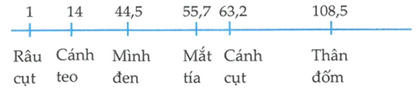 Trật tự phân bố các gene tính theo đơn vị trao đổi chéo trên NST số 2 của ruồi giấm là: 1 - Râu cụt; 44, 5 - Mình đen; 63,2 - Cánh cụt; 14 - Cánh teo; 55,7 - Mắt tía; 108,5 - Thân đốm. Đột biến mất đoạn 15-50 và 60-70 trên NST số 2. Trật tự phân bố các gene trên NST sau đột biến là: