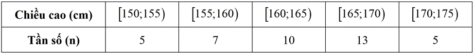 Xét mẫu số liệu về chiều cao \((cm)\) của một nhóm người được ghép nhóm với bảng tần số ghép nhóm sau: