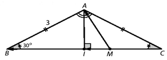 Cho tam giác \(ABC\) cân tại \(A\), có \(\hat A = {120^ \circ },AB = 3\). Lấy điềm \(M\)