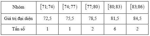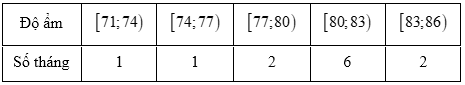 Khảo sát về độ ẩm không khí trung bình các tháng năm 2022 tại Đà Nẵng (đơn vị: %), người ta được một mẫu dữ liệu ghép nhóm như sau: