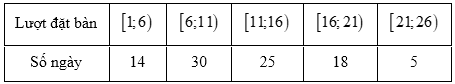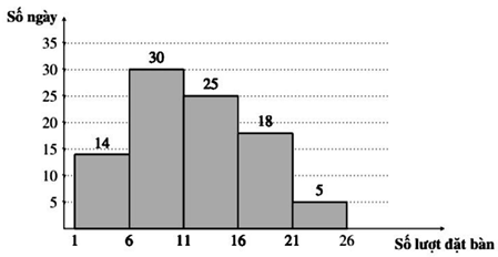 Biểu đồ dưới đây biểu diễn số lượng khách hàng đặt bàn qua hình thức trực tuyến mỗi ngày trong quý \(III\) năm 2022 của một nhà hàng. Cột thứ nhất biểu diễn số ngày có từ 1 đến dưới 6 lượt đặt bàn, cột thứ hai biễu diễn số ngày có từ 6 đến dưới 11 luợt đặt bàn;...