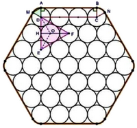 Một nhà máy sản xuất ống thép khi xuất xưởng các ống thép được bó lại tạo thành khối gồm \(37\) ống như hình vẽ. Biết các ống có dạng hình trụ đường kính đáy bằng nhau và bằng\(10cm\). Tính độ dài của một sơi dây đai để buột các ống thép lại với nhau.
