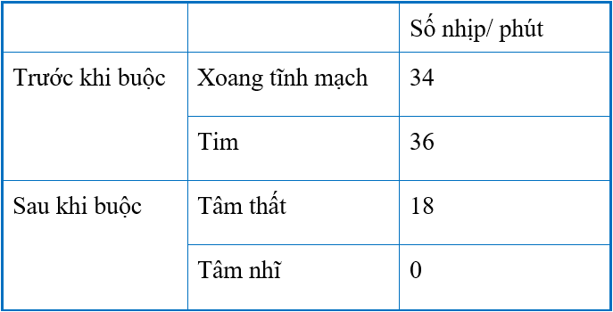 | b) Ở bước 4 khi buộc sợi chỉ máu không thể lưu thông qua động mạch chủ, dẫn đến tim không nhận được máu giàu oxy và chất dinh dưỡng do đó nhịp tim đếm được ở xoang tĩnh mạch giảm sau khi buộc. | ||