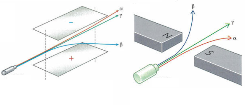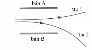 Hai chùm tia bức xạ ion hóa được truyền giữa các tấm kim loại tích điện. Chúng bị lệch, như thể hiện trong hình.