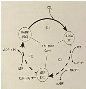 Sơ đồ bên tóm tắt chu trình Calvin trong pha tối của quá trình quang hợp, các chữ số 1, 2, 3 chú